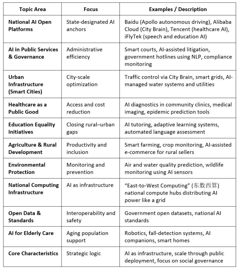 AI will permeate all aspects of Chinese society, from production and services to governance and welfare. The central government provides the foundational framework (policy direction, national data standards, etc.), while private companies compete to build and deploy services within the national framework.