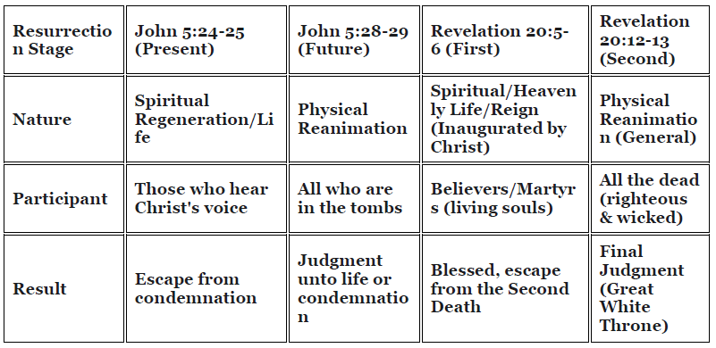 Table 3: The Two Resurrections in John 5 and Revelation 20 and 1 Corinthians 15 we only have two resurrections. The first which has taken place and the last.